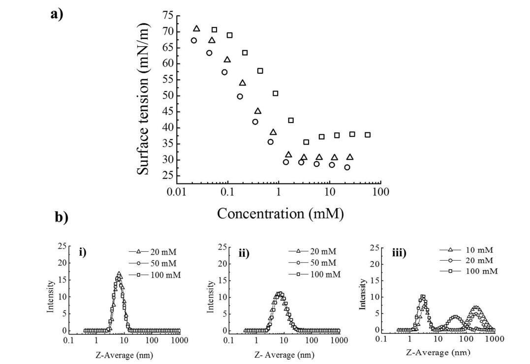 图1:。(a)25°C水中的表面张力曲线(□)美国银行(○)DDQ和(Δ)BAC/DDQ(2:3 mol/mol)。(b)25°C下的PCS强度曲线随浓度变化:(i)BAC(0.3 M NaCl),(ii)BAC/DDQ 2:3 mol/mol(0.05 M NaCl),和(iii)DDQ(5×10−3 M NaCl)。
