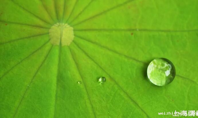 来看一下荷叶。荷叶表面有极其特殊的结构,这种结构让液体完全不能浸润到荷叶的表面。