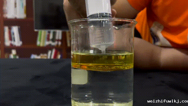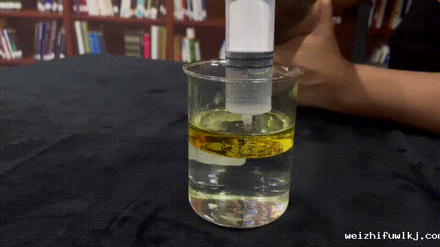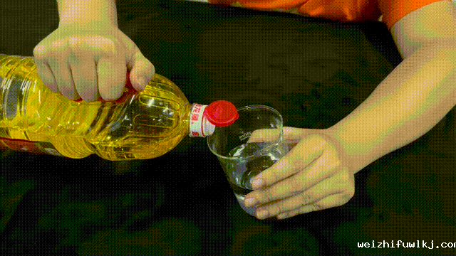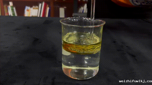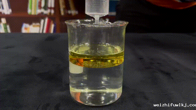 首先,我们沿杯壁向盛有水的烧杯中加入食用油,使水油有一个干净的界面