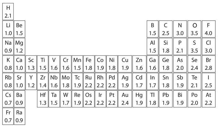 上图是元素周期表中部分元素电负性的标量,电负性是一个无单位数,数字越高,原子吸引电子的能力越强。我们可以通过确定参与共价键的两个原子的电负性的差异来判断共价键的极性: