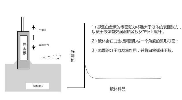 当感测到铂金板浸入到被测液体后,铂金板周围就会受到表面张力的作用,液体的表面张力会将铂金尽量的往下拉。当液体表面张力及其他相关的力与平衡力达到均衡时,感测铂金板就会停止向液体内部浸入。这时候,仪器的平衡感应器就会测量浸入深度,并将它转化为液体的表面张力值。