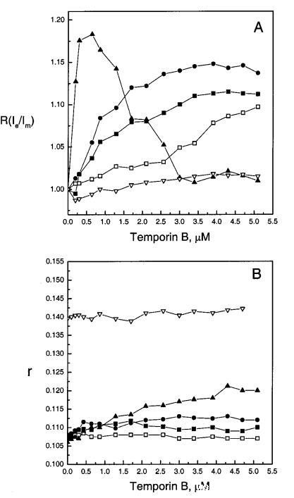 图3:通过芘标记的磷脂PPDPC(X)0.01)的荧光和DPH(X)0.002的稳态发射各向异性r评估颞叶素B对LUV中脂质动力学的影响,显示为具有XPOPG)0(0)、0.10(9)、0.20(B)和0.40(2)的SOPC脂质体中归一化准分子与单体比率r(Ie/Im)(图A)和各向异性r(图B)的变化,Xchol)0.10(3)。每个数据点代表三次测量的平均值。标准偏差小于0.02(面板A)和0.004(面板B),为清楚起见,未显示。否则情况如图2图例所示。