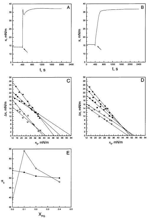 图1:将时间蛋白B和L插入脂质单层。在初始表面压力(π0)分别为14.6和15.5 mN/m的情况下,在SOPC/POPG(XPOPG)0.2)单层下方注射颞蛋白B(面板a)或颞蛋白L(面板B)后,表面压力随时间的增加而增加。肽(0.3µM最终浓度)的添加用箭头标记。表面压力增量(∆π)将0.3µM颞蛋白B(图C)或颞蛋白L(图D)添加到亚相中导致的脂质单分子膜的数量表示为初始表面压力(π0)的函数。SOPC中POPG(XPOPG)的含量分别为0(0)、0.10(9)、0.20(b)和0.40(2)。还显示了将肽插入具有Xchol)0.1(3)的SOPC膜中。图E显示了πc的值,分别作为渗透时间蛋白B(O)和时间蛋白L(B)时XPOPG的函数。每个数据点代表三次测量的平均值。标准偏差在0.1和0.8 mN/m之间变化,为清晰起见,未显示。