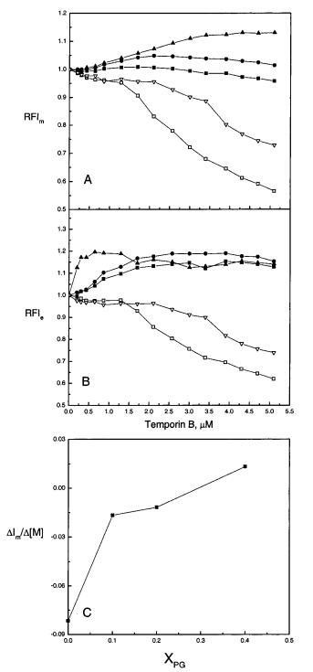 颞蛋白对双层脂质动力学的影响。随后通过记录掺入LUVs的芘标记荧光磷脂类似物PPDPC(X)0.01)的发射光谱来研究肽与脂质体结合的后果。对于含有脂质类似物(如PPDPC)的单个芘部分,稳态Ie/Im值反映了膜中荧光团的横向迁移率和局部浓度(18,19)。然而,我们之前的研究比较了两种其他抗菌肽(马盖宁2和吲哚肽)对膜脂质动力学的影响,发现这些肽也影响芘标记脂质的量子产率(15)。对于SOPC LUV,添加temporin B分别导致芘单体和准分子发射Im和Ie的显着减少,最大减少约40%(图2,面板a和B)。芘荧光带的猝灭是双相的,当时间蛋白B与脂质的摩尔比约为1:12时,量子产率显着降低(图2,面板a和B)。在胆固醇(Xchol)0.10)存在的情况下,temporin B对芘单体和准分子荧光的猝灭也很明显,尽管发射的减少量小于在SOPC LUV中观察到的减少量(图2,面板A和B)。然而,当酸性磷脂POPG存在于XPOPG)0.10时,Im中只有微不足道的变化是明显的,当XPOPG从0.20增加到0.40时,时间蛋白B导致Im以渐进的方式增加,Im的初始增量在大约2/1的POPG/时间蛋白B化学计量比下趋于稳定。在达到饱和响应之前,Im中线性增量的斜率随着XPOPG而增加(图2,面板C)。在POPG存在的情况下,颞蛋白B也增加了Ie。在XPOPG)0.40时,Ie的值逐渐增加,直到颞蛋白B:脂质摩尔比为≈1:15,对应于≈1/6,而当超过该化学计量比时,Ie降低。图3,面板A中显示了由于颞蛋白B引起的Ie/Im的变化。具体而言,SOPC LUV的Ie/Im增加了1.1倍,而在胆固醇(Xchol)0.10的存在下,观察到Ie/Im的微小变化,面板A)。将XPOPG从0.10增加到0.20会逐渐增强Ie/Im的增量。有趣的是,在XPOPG)0.40时,当时间蛋白B:脂质摩尔比为≈1:30.然而,在这一肽:脂比之上,颞叶素B导致Ie/Im降低,而在这一肽:脂比之上,Ie/Im的变化不显着≈1:6.