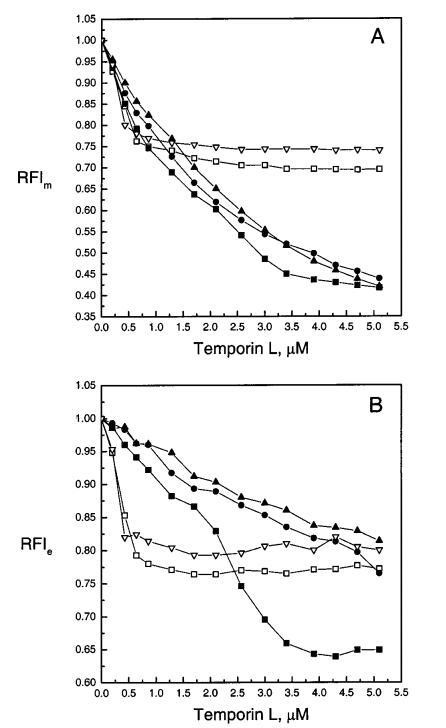 图4:通过芘标记的磷脂PPDPC(X)0.01的荧光评估颞叶素L对LUV中脂质动力学的影响,分别显示为芘单体和准分子发射强度Im(图A)和Ie(图B)的变化。脂质体由SOPC组成,XPOPG为0(0)、0.10(9)、0.20(b)和0.40(2),Xchol为0.10(3)。每个数据点代表三次测量的平均值。标准偏差小于0.02,为清晰起见,未显示。否则情况如图2图例所示。