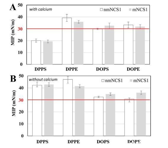 图6.nmNCS1(白色)和mNCS1(灰色)的MIP值,在不存在钙(A)和存在钙(B)的情况下,具有DPPS、DPPE、DOPS和DOPE。MIP值的不确定性如第2.3节所述计算。