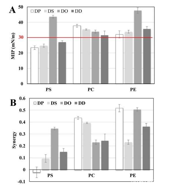 图7.在钙存在下,使用DPP、DSP、DOPS、DDPS、DPPC、DSPC、DOPC、DOPC、DDPC、DPPE、DSPE、DOPE、DOPE和DDPE的单层的N-末端肽的MIP(A)和协同作用(B)值。MIP和synergy值的不确定性如第2.3节所述计算。