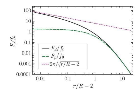 图2显示了两个半径相等的圆形区域的Fd(r)(实线)和Fp(r)(虚线)。叠加在等式(4)的数值解上,我们添加了等式(5)(虚线)的短距离的渐近表达式。注意,当两个域接近接触(r=2R)时,Fd发散,而Fp保持有限。此外,对于实验感兴趣的范围2R o r o 10R,两个力之间的差异是可观的。特别是,即使r=5R,差值也在15%左右。