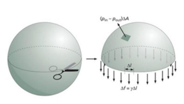 比如说,无重力液滴是一个球形。我们对一个这样的液滴的上半球做一个受力分析,它受到三个力的作用:
