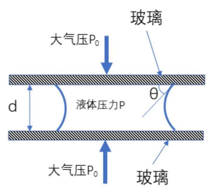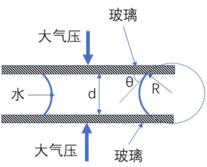 我们可以想象,当两片玻璃间隙非常小的时候,这个凹液面的曲率就会非常大,在这个时候,液体压力与大气压的差就会很大,因此把玻璃挤压在一起的力也就很大。我们可以用杨-拉普拉斯公式来估算一下。