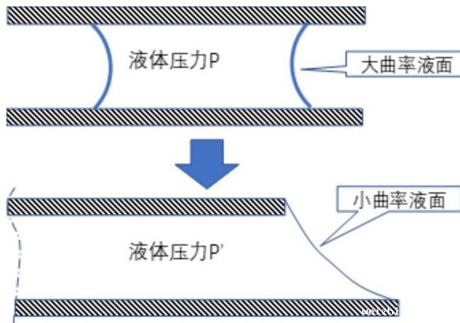 而这里有一件非常关键的事请,就是由于表面张力的存在,弯曲的表面就会在两侧形成压力差。