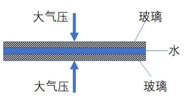 也就是说,由于帕斯卡原理,缝隙中的水也会将大气压传递到两片玻璃的缝隙内部。大气压的作用效果并非是「向内」挤压两片玻璃,因为在缝隙内部同样存在着压力。
