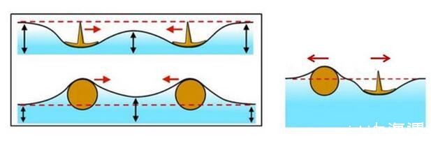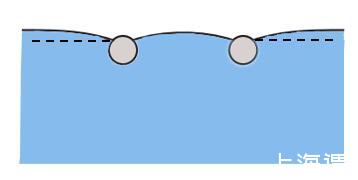 麦片圈效应中使得麦片相互吸引的因素是麦片之间的横向毛细力(Lateral Capillary Force),横向毛细力可分为吸引力和排斥力,这里表现为吸引力。我们通过一个简单的例子,来说明一下横向毛细力产生的原因。首先考虑单个小球放置在液面上保持平衡,意即在重力的作用下对液面形成一个扰动,此时若液面上存在另外一个小球时,这种扰动会相互叠加,下图中的液面便是最终的扰动状态。