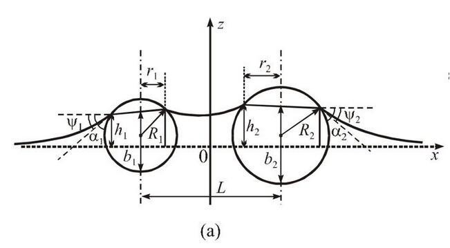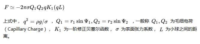 具体过程大家可以阅读文末的参考文献,这里直接给出在小颗粒和液面小变形下假设下,两小球之间横向毛细力的表达式,