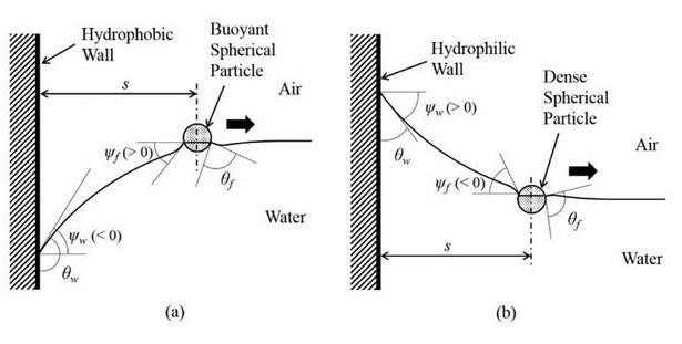 上图便是水上两个漂浮小球的吸引与排斥的判断方法。值得注意的是,我们这里并没有提及小球的浸润性,也就是说,浸润性与横向毛细力的性质并不直接相关。实际上,横向毛细力还可以分为漂浮横向毛细力和浸没横向毛细力。我们讨论的情况是漂浮横向毛细力,由小球的重力引起,题主的所说的浸润性应该换为小球的轻重(与水相比)。例如图(a)里是两个比水重的小球,表面张力将其往上拉。图(b)是两个比水轻的小球,表面张力将其往下拉。表面张力的方向恰好就对应了前述接触线处液面的倾斜角。题主的所要表达的意思其实是: