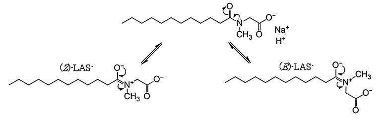 Bordes等人研究了氢键对甘氨酸盐和肌氨酸盐自组装的影响[17]。Gad等人研究了具有不同碳链长度的N-酰基肌氨酸盐的界面张力[3]。还对含有SLA的二元混合物与Gemini表面活性剂[18]和阳离子聚合物[19]进行了一些界面研究。然而,这些研究没有考虑它们的pH影响。Tsubone等人在pH值为10.5[20]时对SLA进行了界面张力测量。然而,SLAS水溶液的界面张力在很大程度上取决于pH,在胶束前和胶束后区域中,当pH小于约7时,其值显着下降。cmc和C20在较低pH下也会降低,但cmc/C20比在pH<7.3时增加。该比值的增加通常意味着亲水头的尺寸增加和/或与反阳离子的缔合增加。在pH<7.3时,Γmax也急剧增加。这些结果清楚地表明,在空气-水界面的较低pH区域,SLA的Na+阳离子被H+取代。向溶液中加入Tl+,证实LAS的界面张力−并且它们以H+<Na+的顺序增加,这与这些结果一致。此外,我们使用1H-NMR和13CNMR研究了D2O和CD3OD中HLA和SLA的结构差异。根据这些结果,例如,来自LAS亲水部分中1小时的所有信号−可以想象,HLA和SLA都具有共振结构,(Z)-LAS−和(E)-LAS−,如图9所示。通过NMR[21,22]的胶束化也报告了这些SLAS异构体的存在。根据分裂峰的积分比,Z/E形式的丰度比确定为SLA为1:1,HLA为2:1。由于E型比Z型体积大,这可能是Γmax随pH值增加而减小的第二个原因,直到pH值为7.3。另一方面,除了RB的各向异性(在pH<7时明显增加)外,含水体中的胶束性质对pH的依赖性小于界面性质。然而,在pH值降低时,聚集数和流体动力学半径的小幅度增加趋势以及胶束核的微极性的减小趋势可以很好地解释为LAS亲水性头基团之间的静电力减小−由Na+到H+的反阳离子置换引起,与界面性质的情况相同。虽然我们尚未确定界面和胶束中HLA的pKa值,但这些值应大于水溶液中的pKa值(pKa,bulk=3.3);界面处的值可能略大于胶束中的值。pH<7时体积较小的Z型的增加也与胶束性质相容,并可能与胶束亲水部分附近RB各向异性的增加直接相关。