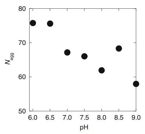 为了评估胶束(Nagg)的聚集数,我们使用带有猝灭剂(HPYL)的探针(Py)的稳态荧光猝灭方法[8]。已发现该探针-猝灭剂对适用于评估几种胶束系统的Nagg[14,15]。Cs=25 mM时的评估Nagg值如图7所示。如图所示,Nagg数值总体上随着pH值的增加而降低。然而,似乎在pH 6.5-7附近也存在一个断裂点。如果是这样,胶束中HLA的pKa预计在6.5到7.0之间,这也比水溶液中的pKa大,就像空气-水界面的结果一样。为了进行进一步讨论,我们需要更精确地确定这些Nagg值。