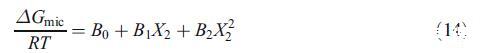 通过使用等式16,可获得参数B2,随后可从等式17获得B1。表2显示了B0、B1和B2的值。本混合系统报告的B1值为−7.91.B1的大负值表明烃链-链相互作用对混合胶束的稳定性也起着重要作用。Maeda还报告了不同二元混合物的负和正B1值,并得出结论,链-链相互作用和头部基团的空间不相容性是这些变化的原因[21]。根据等式14和表2的参数,我们评估了胶束形成的自由能(数据未显示)。这些评估值接近从伪相分离模型获得的值(表1)。