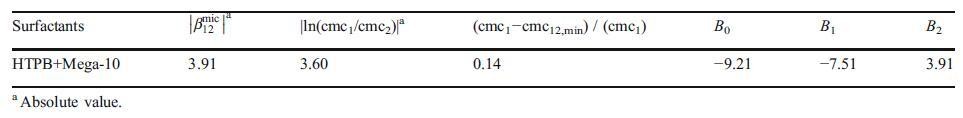 表2胶束中的平均相互作用参数值,bmic 12,ln cmc1=cmc2 jð−cmc12,min)/(cmc1),以及根据Maeda方法的HTPB+Mega-10表面活性剂二元混合物的相互作用参数