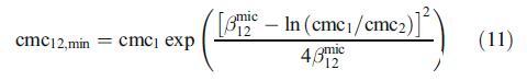 另一方面,在混合胶束形成过程中,含有两种表面活性剂的混合物中协同作用的存在不仅取决于它们之间相互作用的强度,还取决于二元两亲混合物中单个表面活性剂组分的相关性质[23]。因此,混合胶束形成中协同作用所需的条件是bmic 12必须为负(见上节),且βmic 12>jlnðcmc1=cmc2Þj(表2)。对于本二元混合物,这两个条件都满足。混合胶束形成中可能的协同程度通过混合表面活性剂的摩尔浓度与单个组分的摩尔浓度相比的最大降低来测量,即(cmc1)−cmc12,min)/(cmc1),其中cmc12,min是混合表面活性剂的最小cmc,由下式给出: