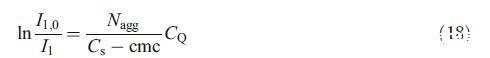 为了评估Nagg,我们使用了实验部分[26]中所述的猝灭剂(CPYC)对探针(芘)的稳态荧光猝灭。该方法基于已知浓度的猝灭剂对发光探针的猝灭。已发现该探针-猝灭剂对适用于评估几种胶束系统的Nagg[3,15–17,24,27]。使用以下方程[26]分析淬火实验:
