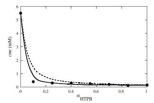 图2 HTPB+Mega-10混合体系混合临界胶束浓度(cmc)与αHTPB的关系图。填充的圆圈表示实验cmc。虚线表示HTPB+Mega-10混合体系理想行为的相分离模型,而实线最符合RST和βmic 12的数据=−3.91