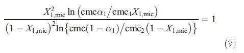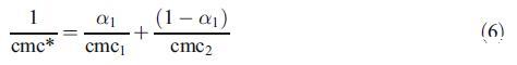 为了讨论由两种二元混合物形成的混合胶束的性质,即混合胶束是否显示理想或非理想行为,我们使用了伪相分离模型[19]。根据该模型,胶束被认为是与含有相应单体的溶液平衡的宏观相。对于二元表面活性剂混合物,理想cmc由方程[19]关联: