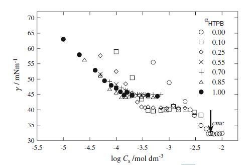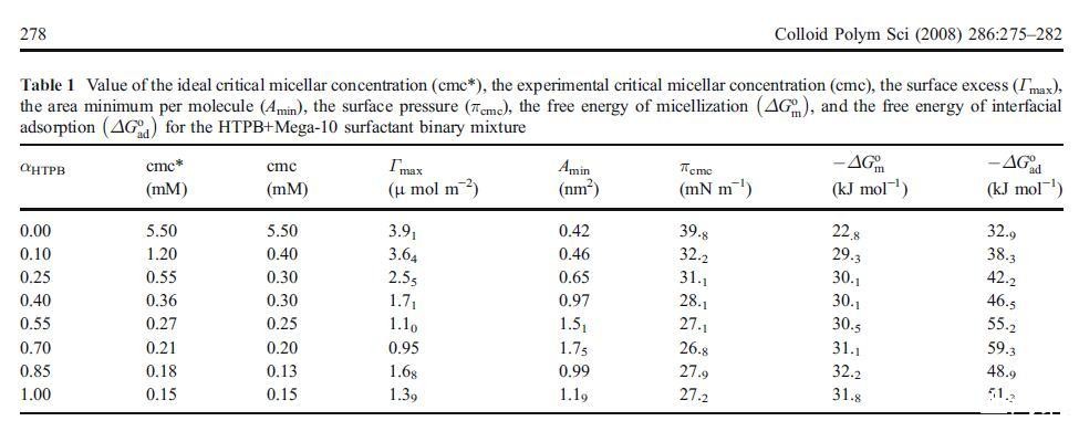 其中R、T和Xcmc分别为理想气体常数、温度,cmc为摩尔分数单位。表1中列出了这些值。HTPB的ΔGo m值比Mega-10更负,表明胶束形成对HTPB比Mega-10更有利。对于两种二元混合物,由于混合cmc值变化不大,ΔGo m值保持不变。除此之外,我们还根据以下关系式[18]评估了空气-水界面吸附的标准自由能ΔGo ad: