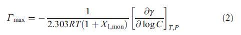 其中γ、C、R、T、P和X1、mon分别为界面张力、表面活性剂浓度、理想气体常数、温度、压力和阳离子表面活性剂(HTPB)的单层组成。在等式2中,我们考虑了界面处反离子的吸附,以计算Γmax。界面上表面活性剂物种占据的平均最小面积Amin然后通过以下方程进行评估: