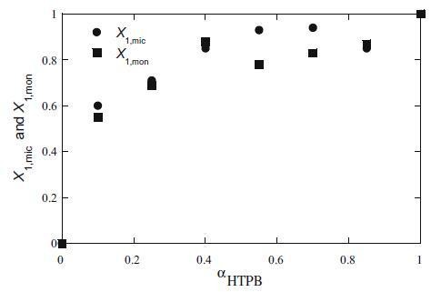 图3 HTPB+Mega-10混合体系的胶束(X1,mic)和单层(X1,mon)组成与αHTPB的关系图