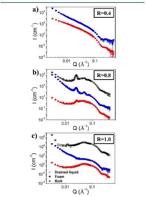 泡沫液体通道内的自组装是摩尔比的函数。为了制备泡沫,我们选择了三种摩尔比R,在15°C下,存在三种不同的自组装结构:多面囊泡(R=0.4)、层状相和胶束之间的混合物(R=1.8)和球形胶束(R=2.0)。42我们使用SANS实验来探测泡沫并确定泡沫液体通道内存在的自组装体。43泡沫的散射强度如图2所示。为了比较泡沫中存在的自组装和体中的自组装,我们还绘制了制备泡沫的体散射光谱。