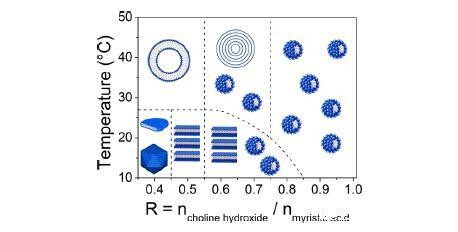 肉豆蔻酸/氢氧化胆碱体系作为摩尔比函数的本体相图。我们首先回顾了肉豆蔻酸/氢氧化胆碱系统的相图,该相图是在之前的研究中通过耦合SANS和透射电子显微镜实验确定的R和温度的函数(图1)。30