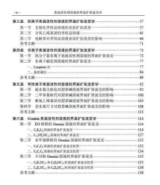 本书以国家科技重大专项的科研成果为基础,以表面活性剂溶液的界面扩张流变学研究为核心,全面介绍界面扩张流变学的概念、理论基础、方法、仪器和数据处理,系统分析模量、相角、弹性、黏性等界面流变参数的时间、频率和浓度依赖性与界面膜性质的关系,探讨界面弛豫过程的特征参数;分类描述了阴离子表面活性剂、阳离子表面活性剂、非离子表面活性剂、两性离子表面活性剂和Gemini表面活性剂在空气-水和油-水界面的扩张流变性质;重点阐释了通过界面扩张流变学研究手段获得流体界面吸附分子相互作用及微观行为的方式。