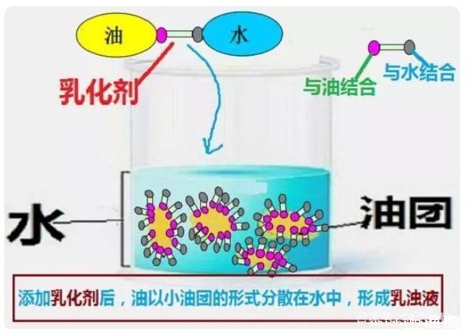 两种互不相容的液体混合到一起,不管怎么搅拌,只要静置一段时间,它们就又会出现分层的现象。这是表面张力的作用,液滴中的不溶液滴聚集,最终只能向分层的状态变化。而如果加入了乳化剂,情况就不一样了,由于乳化剂既有亲水基团,又有疏水基团,所以构成了两种液体之间的桥梁。