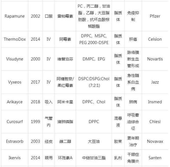 由于EPR效应,脂质纳米粒在肿瘤中的蓄积使得纳米颗粒在肿瘤细胞附近选择性地释放抗肿瘤药物。Doxil是最早获批的抗肿瘤纳米制剂,也是最早获批的脂质体药物。该产品可以改善蒽环类药物阿霉素的药代动力学和生物分布,阿霉素是一种强效抗癌剂,但具有心脏毒性。Doxil利用EPR,使用空间稳定的纳米颗粒(~100 nm)来延长药物在血浆中的循环时间,同时降低多柔比星的心脏毒性。Doxil作为静脉注射剂开发,由大豆磷脂酰胆碱、胆固醇和DSPE-PEG2000组成,用于治疗晚期卵巢癌、多发性骨髓瘤和HIV相关的卡波西肉瘤。