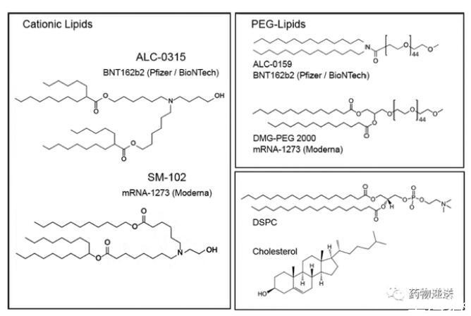 两款mRNA疫苗采用的脂质纳米粒组成非常相似。都含有可电离的脂质,该脂质在低pH值时带正电利于与mRNA静电作用络合,在生理pH值时呈中性促进mRNA的递送和释放并减少潜在的毒性。都含有聚乙二醇化脂质,以减少血清蛋白的抗体结合和吞噬细胞的清除,从而延长全身循环时间。磷脂二硬脂酰磷脂酰胆碱(DSPC)和胆固醇形成稳定结构有助于包载mRNA。两款疫苗的可电离阳离子脂质:PEG-脂质:胆固醇:DSPC的摩尔比分别为46.3:1.6:42.7:9.4(Pfizer/BioNTech)和50:1.5:38.5:10(Moderna)。脂质纳米粒的粒径为80~100nm,每个脂质纳米粒中包含有约100个mRNA分子。