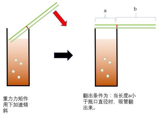 即当满足上图的几何关系时,吸管才会翻出来。显然是倾斜时,吸管向上的速度越大,越容易翻出来。吸管向上速度大小跟气泡的黏附量有关,而气泡的黏附量与吸管的表面积和表面能,溶液中的气泡量等都有关。