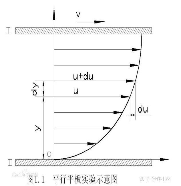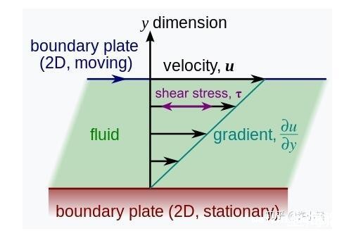 在这张图中,下方的平板和两个平板间的液体保持相对静止,且液体内部没有对自身体内不同质点的相对流动,而将上方平板做水平向右的推动。可以看见,在与上方平板直接接触的一层液面处可以达到与被推动的平板相同的速度,而在垂直距离上越远离上层平板的部分的速度越慢,直到最下层与下方平板直接接触的液面处速度为零,在两个平板之间存在一个连续变化的速度分布。