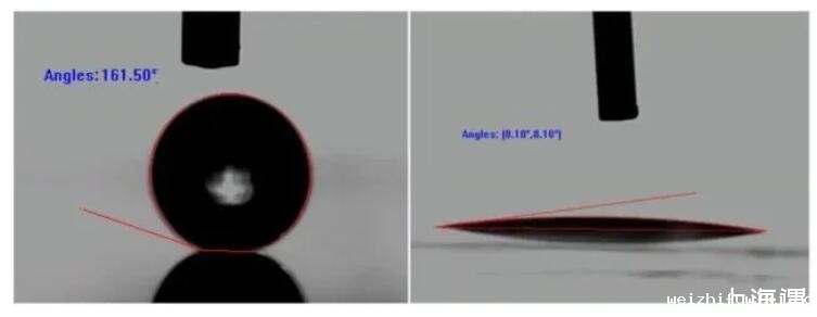 不仅是自然界中,科学家们在实验室中也制备出效果更加显著的超疏水或超亲水表面,比如下图中呈现出极端的非浸润与浸润现象。