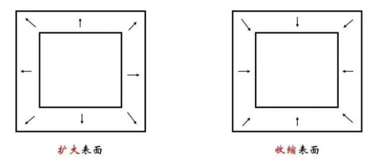 那么表面张力的方向是什么呢?我们同样类比重力、弹力等力。简单回顾不难发现,如果将表面张力理解为单位面积形变引起的能量升高,那么对应的力应该指向使得能量降低的方向。对于表面张力,自然就是沿切线使得表面收缩的方向。