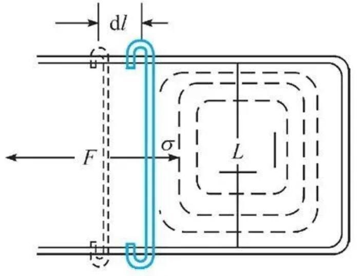 我们曾经提到比表面能的单位是J/m,而将这个物理量从力的角度去理解对于处理一些问题更加直观,我们常常将比表面能称为表面张力。而J/m=N/m,并不是力的单位N,因此表面张力代表的是作用在单位长度的表面上的力。在下图所示的实验中,肥皂水膜在力F的牵拉下长大,表面张力便是