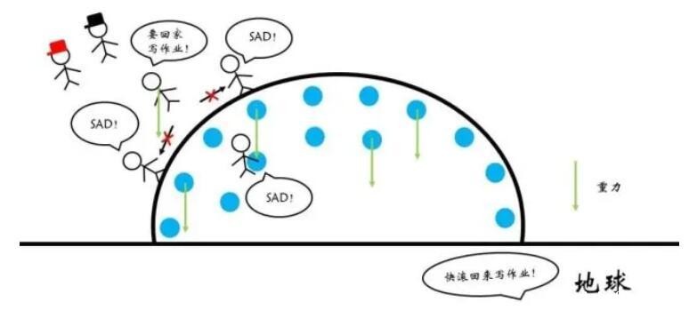 这样的理解虽然直观,但是缺少了几分更加深入的视角,也没办法真正理解什么是表面张力。那怎么办呢?我们来看看与力对应的能量(特指势能)。以重力为例,大家可能听说过重力势能,即某一地球附近的物体由于处于一定的高度而蕴含的能量。更加直观地讲,如果以地面为势能零点,则物体在重力的作用下下落到地面所能释放的能量就是重力势能。