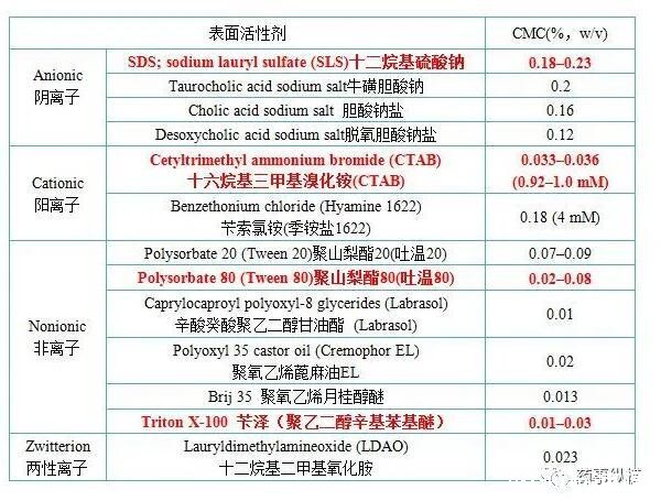 如果上述条件都不合适,可以考虑采用加入表面活性剂,此时应查询国内外文献、专利、质量标准,并结合药物结构选择表面活性剂的种类。筛选时,应根据情况考虑涵盖所有常用种类的表面活性剂,比如阴离子型、阳离子型、和非离子型。USP中列举了多种商品化的表面活性剂及其临界胶束浓度(Critical Micelle Concentration,CMC)的近似临界值,在方法开发中可以参考。