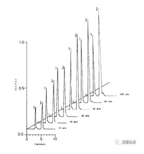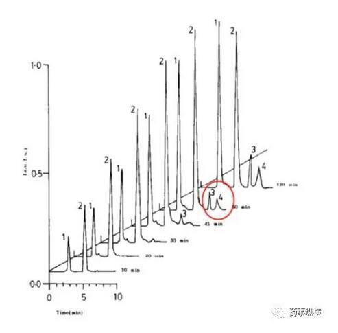 利福平在酸溶液中的降解情况(3、4为两个降解物峰)
