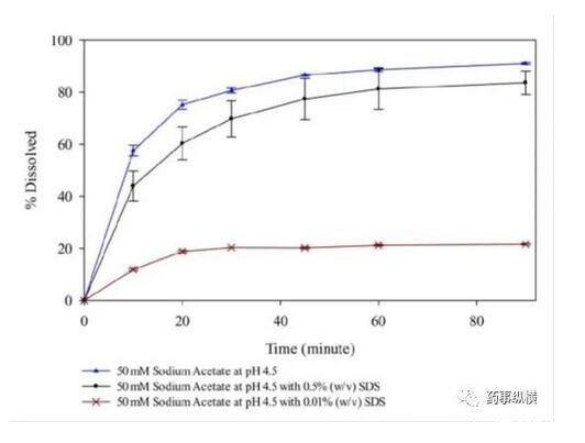 研究中发现,在含有低于CMC浓度的SDS的pH4.5介质中形成了不溶性盐,影响了药物的溶解度和制剂的润湿性,而在高pH时这种现象不明显。pH4.5介质中,当SDS浓度高于CMC浓度时,其溶出也比不加SDS的情况慢。