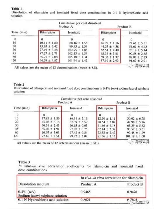 利福平与异烟肼复方制剂在进行溶出曲线测定时发现利福平在0.1N盐酸中不稳定,发生降解。由于利福平在水中不溶,因此采用了0.4%SDS溶液进行了研究,结果表明在整个分析检测过程中无降解。而且,0.4%SDS溶液的体内外相关性很好。