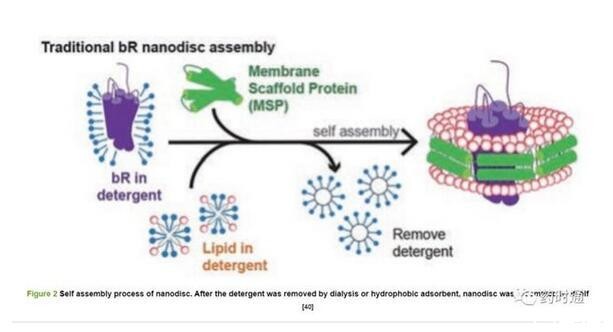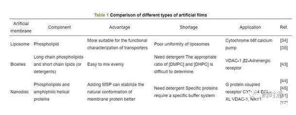 与双胞体一样,纳米盘的第一步是基于洗涤剂的增溶,需要优化所使用的洗涤剂的性质和浓度,这在纳米盘重组中可能造成蛋白质活性损失,因此同样存在洗涤剂使用相关问题的限制。表1[34,35,41-45]比较了脂质体、双胞体、纳米盘的组成及其优缺点。