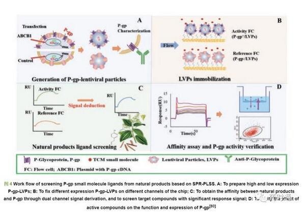 针对慢病毒载体稳定技术结合SPR在中药活性成分筛选中的应用,本课题组已展开一些探索性研究。P-糖蛋白(P-gp)是体内最重要的外排型转运蛋白,具有12次跨膜的复杂结构,且尚未商品化。Cao等[80]采用LVPs稳定策略,获得活性良好的P-糖蛋白,构建了一种基于SPR的P-糖蛋白配体筛选系统。首先,获得P-gp高表达和低表达的LVPs,然后将P-gp高/低表达的LVPs分别固定在CM5芯片上作为活性通道和参比通道。以P-gp抑制剂伐司朴达(valspodar,Val)和环孢素(cyclosporin,CsA)为阳性对照,从天然产物库中快速筛选出厚朴酚、和厚朴酚和白藜芦醇作为潜在的P-gp配体(图4)[80]。Chen等[81]构建了CXCR4的配体筛选体系,将高/低表达的CXCR4的慢病毒颗粒固定在CM5芯片上,以趋化因子受体拮抗剂AMD3100为阳性化合物,从川芎提取物中筛选出洋川芎内酯Ⅰ为CXCR4的潜在配体。