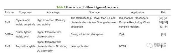 针对洗涤剂和人造膜分离纯化和稳定MPs的不足,研究人员从保护MPs周围局部脂质环境的思路出发,开发出了完全不添加洗涤剂的新方法,采用包括苯乙烯马来酸、二异丁烯马来酸、聚甲基丙烯酸酯等聚合物来稳定含有MPs的纳米级脂质圆盘。