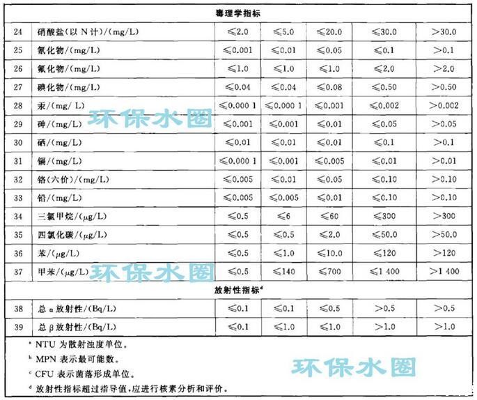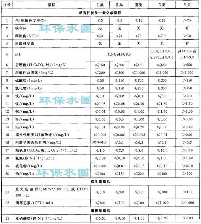 依据我国地下水质量状况和人体健康风险,参照生活饮用水、工业、农业等用水质量要求,依据各组分含量高低(pH除外),分为五类。
